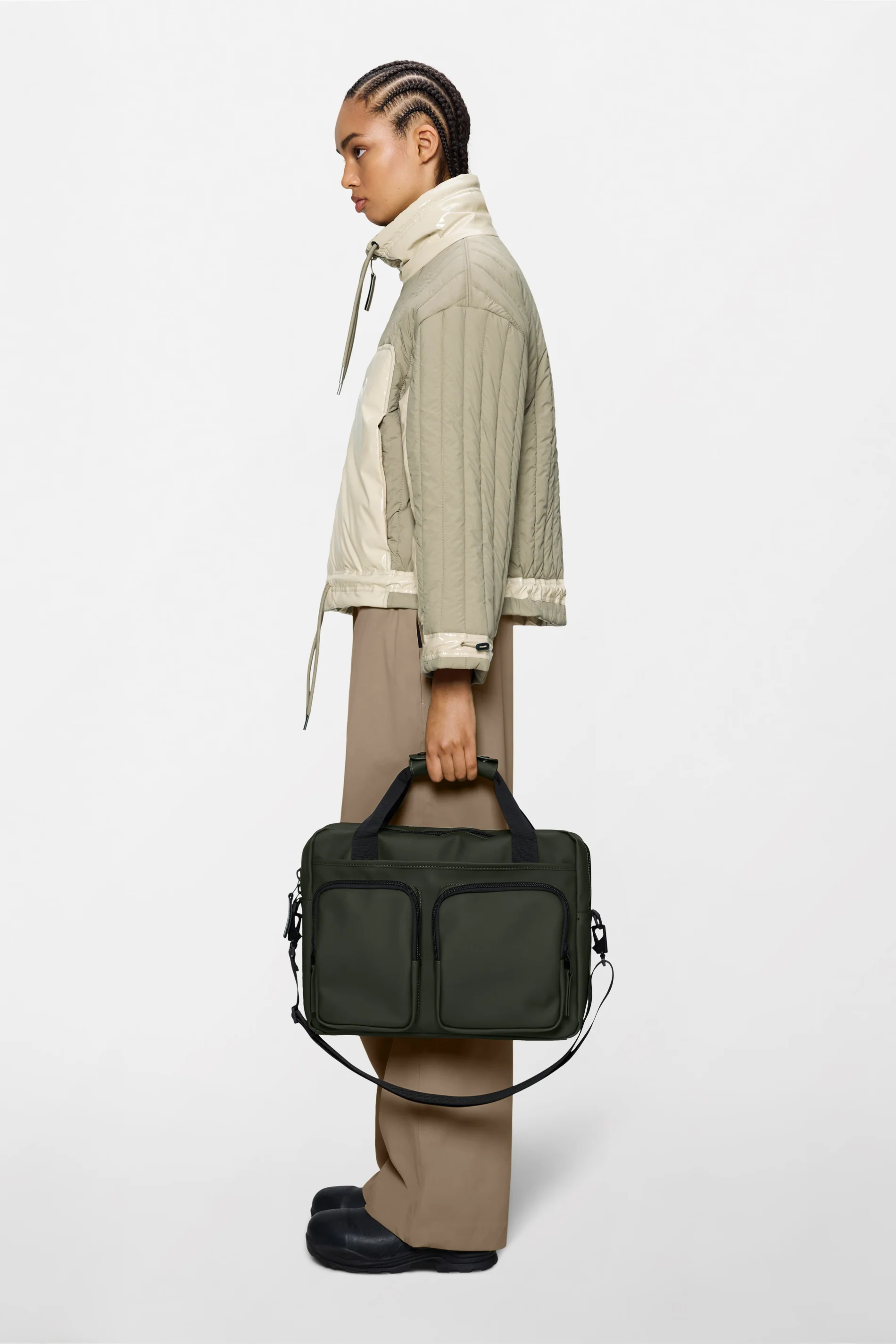 Texel Tech Bag is cut from Rains’ signature waterproof PU fabric, engineered for carrying strength, durability, and a smooth feel.